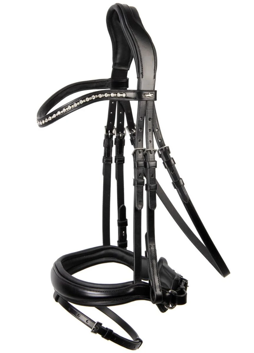 BRANTFORD combines functionality and sporty design: The bridle with an anatomically shaped crank noseband has a unique neck piece. This was specifically adapted to the horse’s anatomy and allows unconfined movement of the ears. Due to the reduction of pressure in sensitive areas around cheekbone and neck, the comfort of the horse is considerably enhanced.